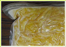 青ゆずは、主に「青ゆず胡椒」の原料として使われ、自動皮剥き機を使い原料となる青皮に加工します。 黄ゆずは、当加工場で搾汁した「ゆず果汁」や、スライサーで2mmにカットした皮を袋詰めにした「ゆず皮」として出荷します。また、加工所にはミクロマイスター(ペースト機)も設備しており、ペースト製造も行っています。